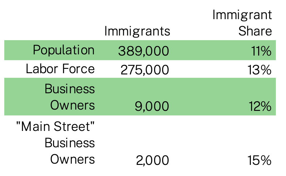 Nationally, while immigrants comprise 14% of the U.S. population and 18% of the labor force, 22% of all business owners are immigrants, as are 27% of all Main Street business owners.