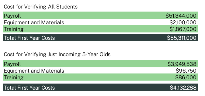 The cost of evaluating the status of only newly enrolling students would be lower. Verifying every 5-year-old coming to school for the first time the cost would cost roughly $4 million statewide (1/13th of the total), and the cost of including all newly enrolling students could well be double or triple that amount, since students move into and out of districts at every grade level.
